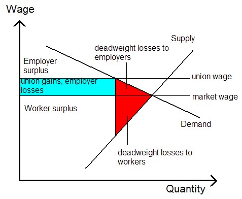 This graph shows that the union wage differential leads some businesses move to different states, so that the demand for New Hampshire union labor is lower. This increases deadweight loss, first because there are more people who would like to work at the market wage, but can't. Second, when businesses leave the state to avoid the higher union wages, the businesses do better, but the costs of moving are pure deadweight losses, as opposed to the higher wages, which redistribute wealth from employer to employee (businesses shift from blue to smaller red losses).
