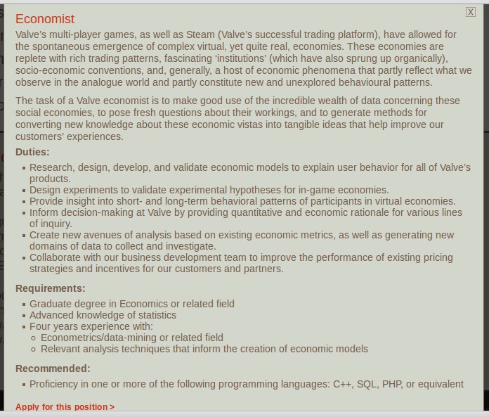 What can you do with an economics degree? Well, for one, the video game company Valve is hiring: